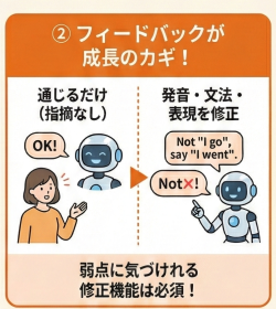 たしかに「話すこと」に慣れるのは大切ですが、それだけでは自分の弱点に気づけません。発音は正確だったのか、文法や表現は自然だったのか──そうしたフィードバックがなければ、成長の実感は得にくくなります。