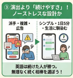 英語は「続けた人が伸びる」もの。だからこそ、派手さよりも、シンプルでストレスなく使える設計かどうかが大切です。