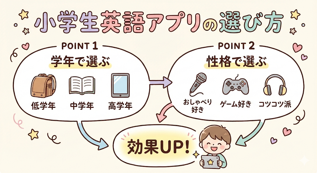 「種類が多すぎて、どれがいいのか分からない…」そんなふうに迷ってしまう方、多いんですよね。英語アプリって本当にたくさんあるんですけど、お子さんの学年や性格に合わせて選ぶと、グッと効果が変わってきますよ。ここでは、失敗しにくい選び方のポイントをお伝えします。