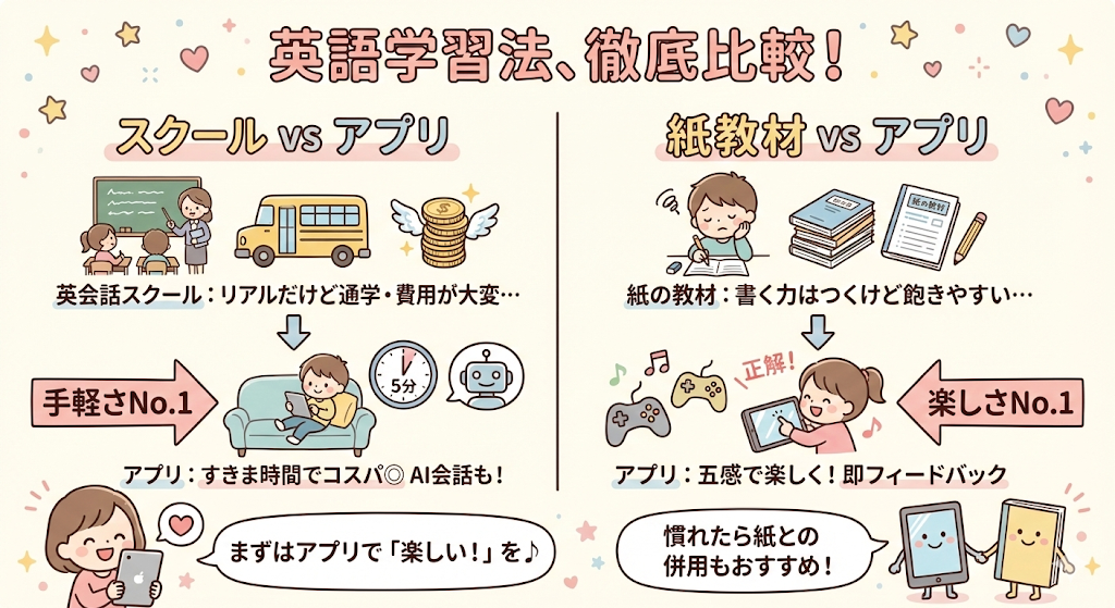 「やっぱり英語って教室に通わせたほうがいいのかな?」「昔ながらのドリルのほうが効果あるのでは?」と悩むこと、ありますよね。実は、アプリにはアプリの強みがあるんです。ここでは、英会話スクールや紙の教材とどう違うのか、リアルな視点で比べてみます。