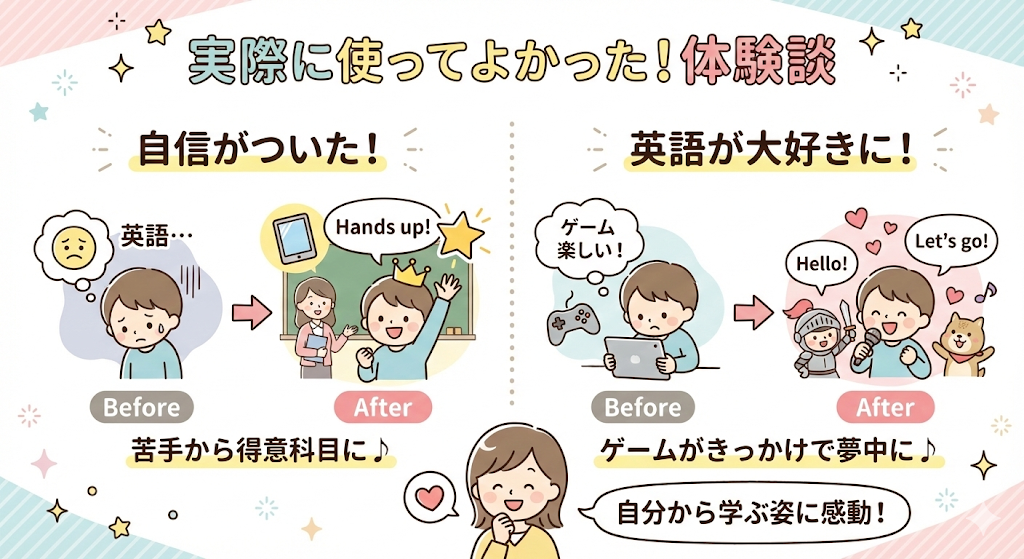 「他のおうちはどうしてるの?」そんなふうに気になること、ありませんか?実際に英語アプリを使ってみたご家庭からは、たくさんの前向きな声が届いています。ここでは、実際にあった変化やきっかけをご紹介します。