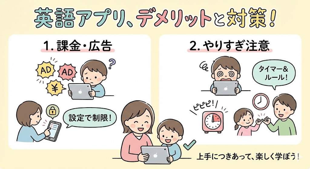 どんなに便利な英語アプリでも、ちょっとした注意点はあります。「無料だから安心」と思っていたら…「気づいたらずっと画面を見ていた」なんてことも。ここでは、事前に知っておきたいポイントと、上手に使うためのコツをお話ししますね。
