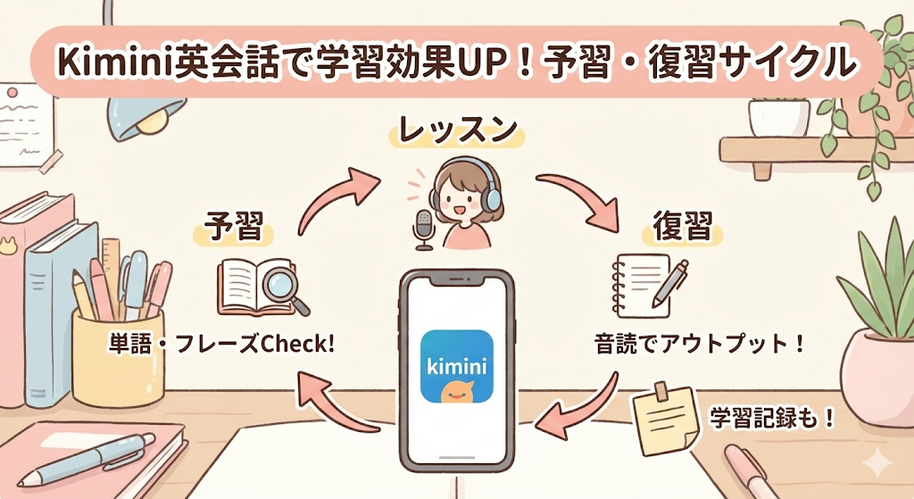 英会話は「レッスンを受けるだけ」では上達しません。しっかりと予習・復習をすることで、定着率がグンとアップします。Kimini英会話アプリなら、予習・復習機能が充実しているので、忙しくても効率よく学習できますよ!