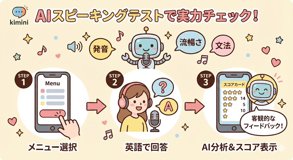 「英語を話せるようになりたいけど、どれくらい上達しているのか分からない…」そんな時に便利なのが、Kimini英会話アプリのAIスピーキングテスト!発音や流暢さ、文法の正確さまでAIがしっかり分析してくれるので、自分の実力を客観的にチェックできます。