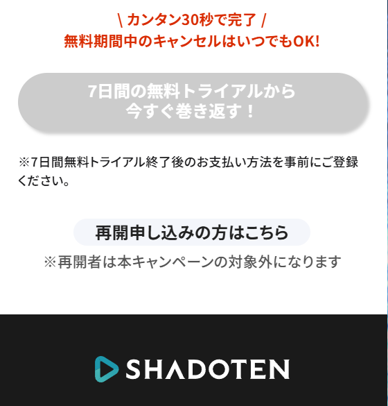 シャドテンの無料体験は「初回登録日を1日目として7日間」。この期間中に解約しなければ、8日目に自動的に課金が始まります。つまり、申込日を含めて「いつが7日目なのか」をしっかり把握しておくことが重要です。例:7月1日に申込んだ場合、7月7日までが無料、7月8日0時から有料プランに切り替わるイメージです。