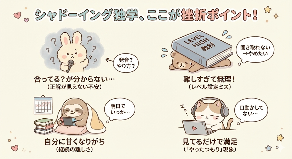 シャドーイング教材を独学で使うと挫折しやすい一番の理由は、「正解が見えにくい」ことにあります。誰かにチェックしてもらえる環境がないため、発音が合っているのか、やり方が正しいのか分からないまま進んでしまい、不安だけが積み重なってしまうのです。また、最初からレベルの高い教材を選んでしまい、「聞き取れない→ついていけない→やめたくなる」という負のループに入るケースもとても多いです。