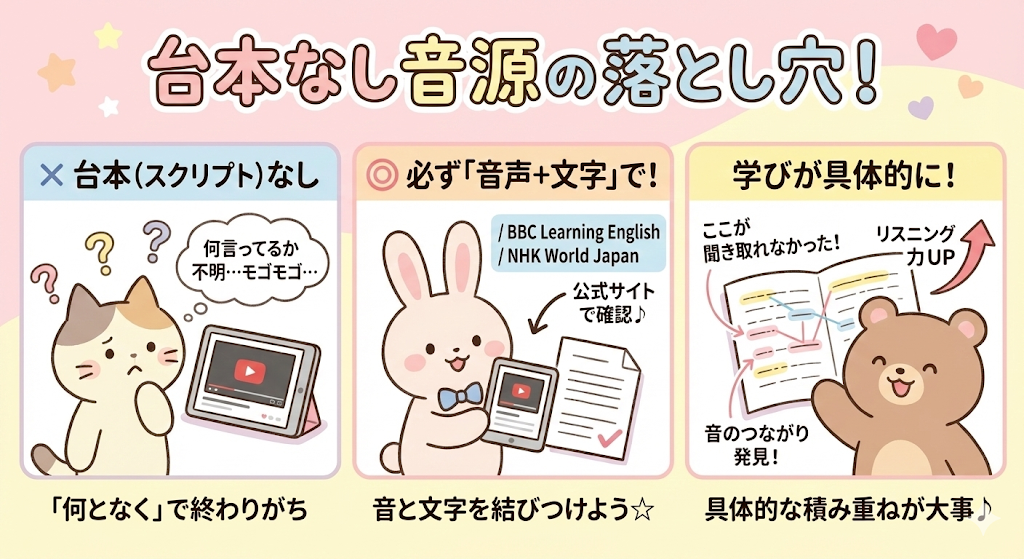 YouTubeだけでも問題ありませんが、スクリプトが確認できるチャンネルを選び、範囲を決めて使うことがポイントです。聞き流しにならない工夫が必要です。