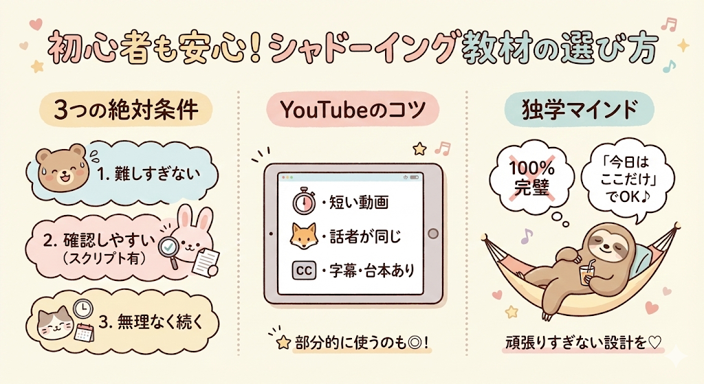 ここまでの話を踏まえると、独学シャドーイング教材にはいくつか共通した条件があることが分かります。難しすぎず、確認しやすく、生活に無理なく組み込めること。この3つが揃っていると、続けやすさが大きく変わります。