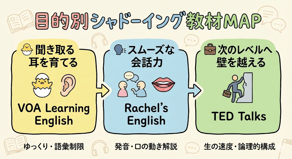 シャドーイング教材を独学で選ぶとき、「有名かどうか」よりも大切なのが目的との一致です。聞き取れるようになりたいのか、日常会話をスムーズにしたいのか、それとも次のレベルへ進むための壁を越えたいのか。目的が曖昧なままだと、教材を渡り歩くだけで終わってしまいがちです。ここでは、目的ごとに「これを選べば失敗しにくい」と言える具体的な教材・YouTubeチャンネルをはっきり示していきます。