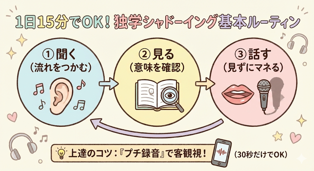 この3ステップを1セットとして回すだけでも、耳と口の両方をしっかり使うことができます。特に最初の「聞くだけ」の時間を入れることで、内容の予測ができ、シャドーイング時の負担がぐっと下がります。短時間でも集中できる形を作ることが、独学成功のカギです。