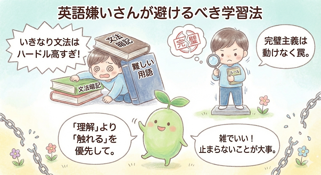 特に、用語が多い文法解説は注意が必要です。主語・目的語・補語などの言葉を理解するだけで疲れてしまい、肝心の英語そのものに触れる前に挫折してしまうケースも多く見られます。英語が嫌いすぎる状態では、「理解する勉強」より「触れる体験」を優先したほうが、結果的に前に進みやすくなります。