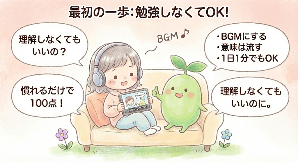 勉強から始める必要はありません。音を流す、文字を見るだけなど、負担のない形で触れることからで大丈夫です。