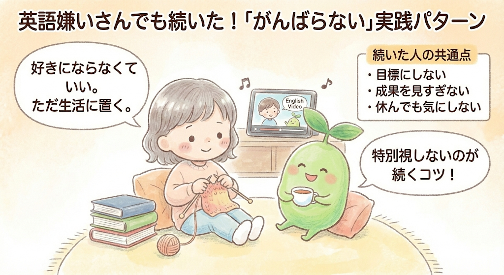 続いた人たちは、「好きでも嫌いでもいいから、生活の中に置いておく」というスタンスを取っています。英語を特別視せず、天気やニュースと同じように“あるもの”として扱う。この距離感が、英語が嫌いすぎる状態から抜けるきっかけになります。