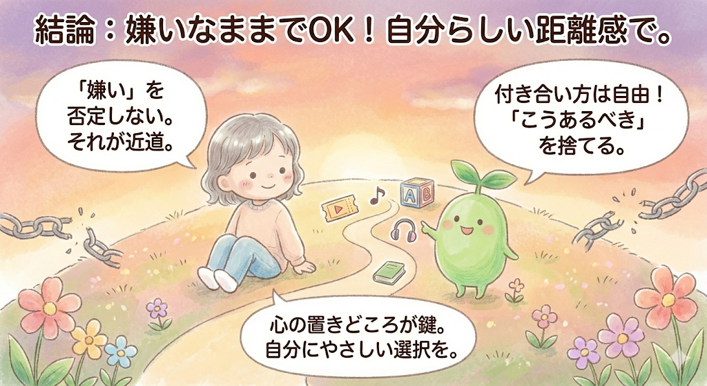 まとめると、英語が嫌いすぎる状態は、欠点ではありません。それはこれまでの経験が作った自然な感情です。その感情を尊重しながら、自分なりの関わり方を選ぶことが、いちばん現実的でやさしい選択だと言えるでしょう。