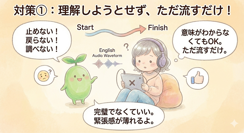 一つ目の対策は、とても単純ですが効果が高い方法です。それは「英語を理解しようとしない」と最初から決めてしまうことです。多くの人は、聞き取れない部分が出た瞬間に止めたり、戻ったり、調べたりします。でも英語が嫌いすぎる状態では、その行動自体が負担になります。