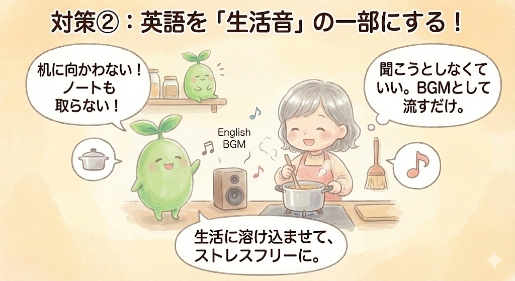 二つ目の対策は、英語を「勉強」から完全に外すことです。机に向かう、ノートを取る、成果を確認する、といった行為をすべてやめます。その代わり、英語を生活の音の一部として扱います。たとえば、家事をしながら英語音声を流す、移動中に英語の動画をBGMとして流す、といった形です。