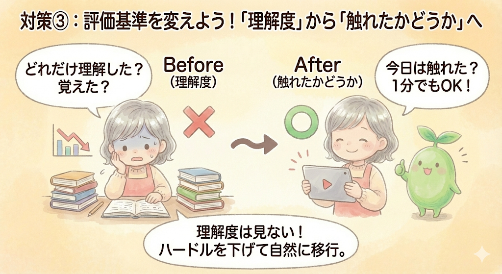 対策③ 評価基準を「理解度」から「触れたかどうか」に変えた