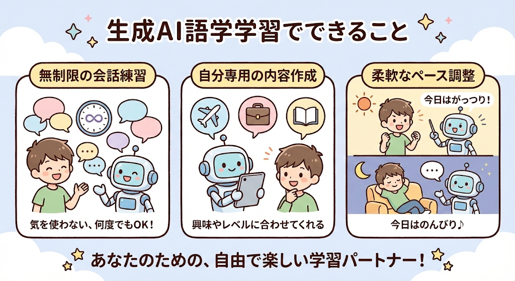 生成AI語学学習のいちばんの強みは、会話練習を何度でも、時間や相手を気にせずできることです。間違えても気まずくならないし、沈黙しても待ってくれます。この「気を使わなくていい環境」が、実はとても大きな価値なんです。