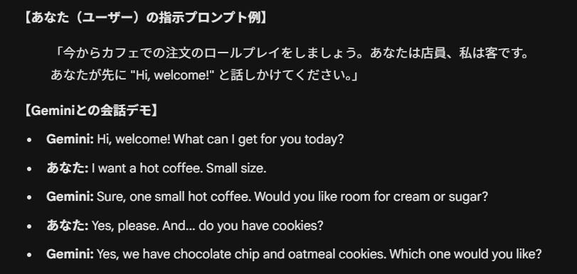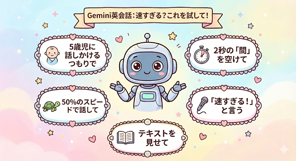 | 4. ライブ会話 での指摘 | Gemini Live(音声会話)の場合、早くなった瞬間に割り込んで修正させる。 | Too fast! Slower! (速すぎる!もっとゆっくり!) Wait, say that again very slowly. (待って、もう一回すごくゆっくり言って) |