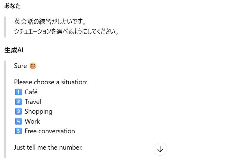 生成AI語学学習では、「実際に使う場面」を意識するほど効果が高まります。現実に近い設定で練習すると、記憶にも残りやすく、「これ前に練習したな」と思い出しやすくなるからです。