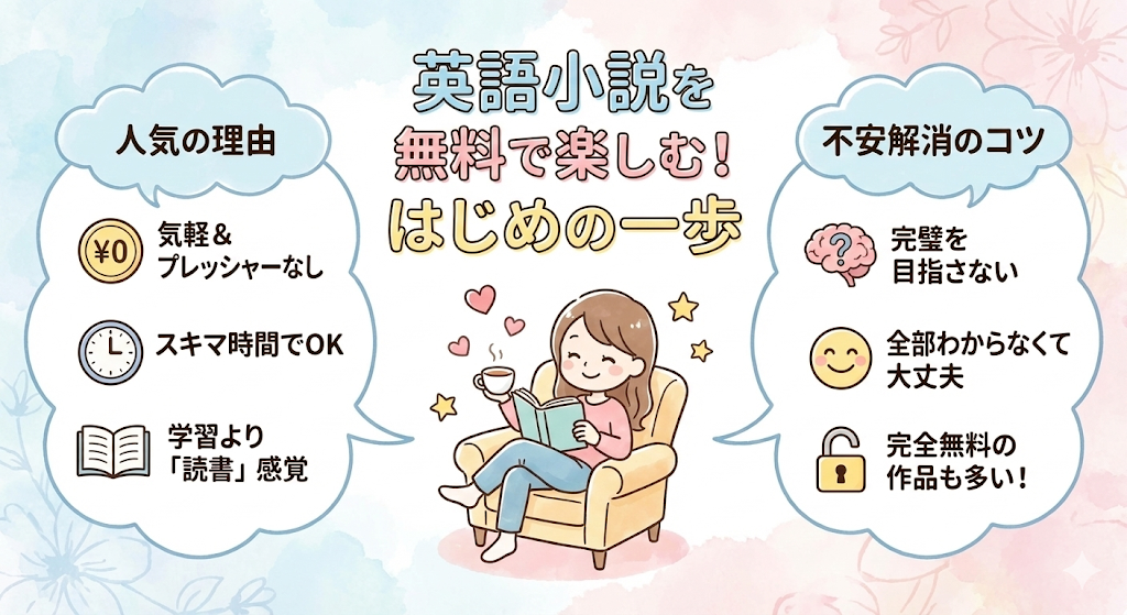 最初から「ここまで無料」と分かっていれば、気持ちの切り替えもしやすくなります。最後まで読める作品を選べば達成感も得られますし、途中までと割り切れば気軽に試せます。英語の小説を無料で読む目的は、完走することよりも英語に触れる時間を増やすことだと考えると、気持ちがずっとラクになります。