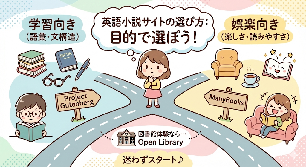 英語の小説を無料で読むサイトは、「学習寄り」と「娯楽寄り」に分けて考えると選びやすくなります。語彙や文構造を意識したいならProject Gutenberg、読みやすさや楽しさを重視するならManyBooks、図書館的な体験をしたいならOpen Library、といった具合です。目的をはっきりさせるだけで、途中で迷うことがぐっと減ります。