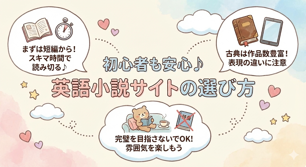 英語の小説を無料で読もうと決めたものの、「どれを選べばいいのか分からない」「最初の一冊で挫折しそう」と感じる人はとても多いです。実は、英語力よりも“選び方”でつまずいてしまうケースがほとんど。ここでは、英語の小説無料で失敗しにくく、自然に続けやすくなるサイト選びの考え方を整理します。読む前の準備だけで、気持ちはかなりラクになりますよ。