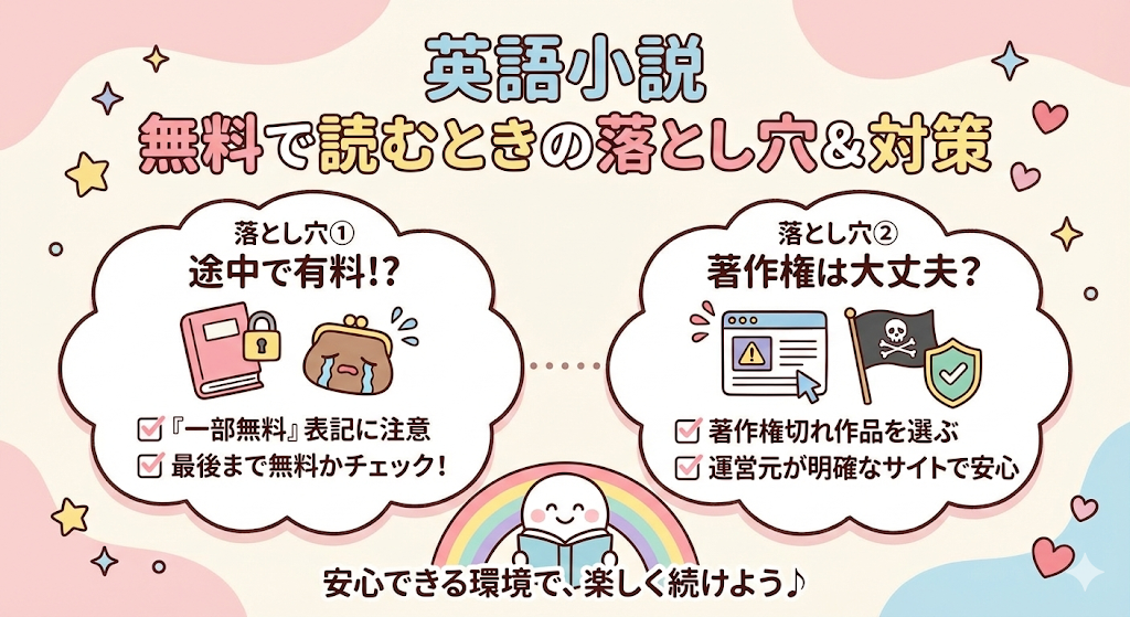 もうひとつよくある不安が、「途中で有料になるのでは?」という点です。英語の小説を無料で読めるサービスの中には、最初だけ無料で続きは課金、というケースも確かに存在します。ただし、最初から最後まで無料で読める作品も多く、事前に見極めるポイントを知っておけば避けられます。このあとの章で、安心して使える選び方も詳しく解説していきます。