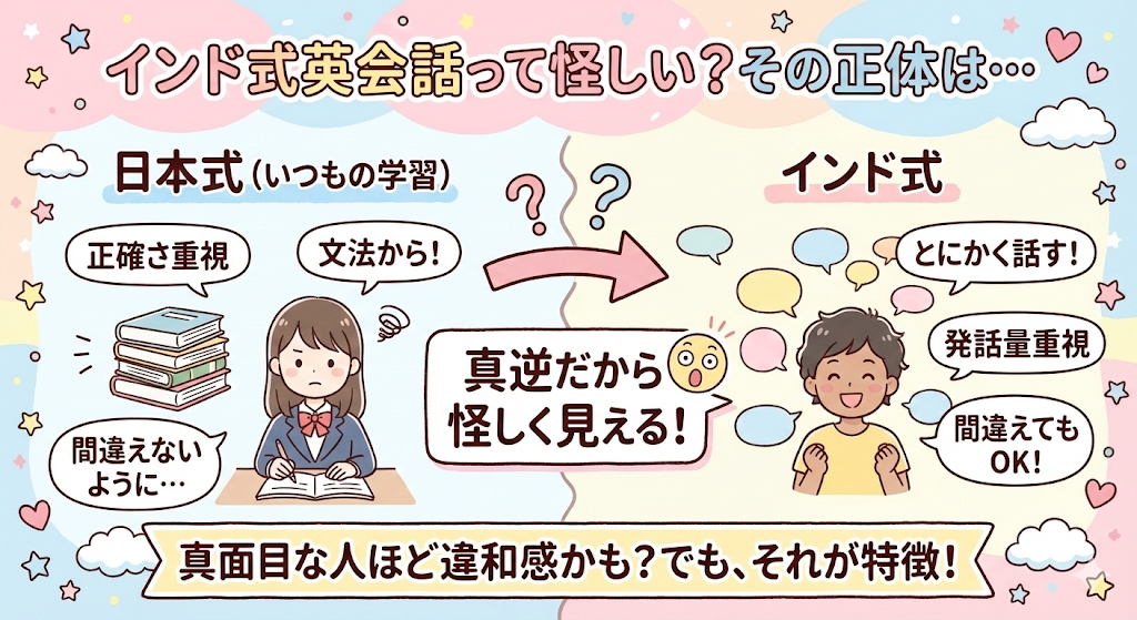 インド式英会話そのものが怪しいというより、日本の英語学習と考え方が大きく違うため、不安に感じられやすい学習法です。正確さより発話量を重視する点が誤解されやすいですが、英語を第二言語として使う環境では一般的な考え方でもあります。