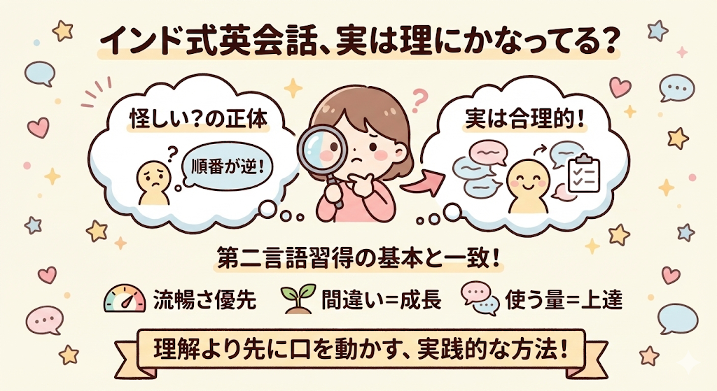 こうして見ると、インド式英会話は突飛な方法というより、「話せる人たちが自然にやっていること」を学習用に整理した形だと分かります。