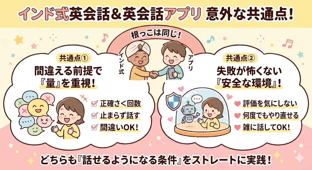 ここまで読むと、「この考え方、どこかで見たことがあるかも」と感じた方もいるかもしれません。実は、インド式英会話と英会話アプリは、学習の根っこにある思想がとてもよく似ています。見た目や形式は違っても、目指している方向は驚くほど共通しているのです。