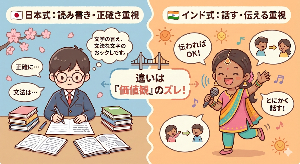 インド式英会話が怪しいと感じられやすい背景には、英語学習法の違いだけでなく、日本とインドの教育そのものの違いがあります。どちらが良い悪いという話ではなく、育ってきた学習環境が違うことで、「英語に対する感覚」も大きく変わっているのです。