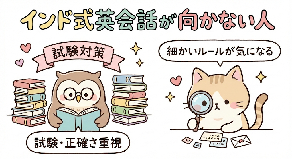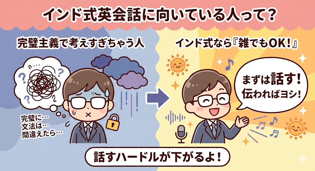 ここまで読み進めて、「考え方は分かったけれど、自分に合うのかどうかが一番気になる」と感じている方も多いと思います。インド式英会話は、誰にでも万能な方法ではありませんが、これまで英語学習でつまずいてきた人ほど、相性が良いケースが少なくありません。