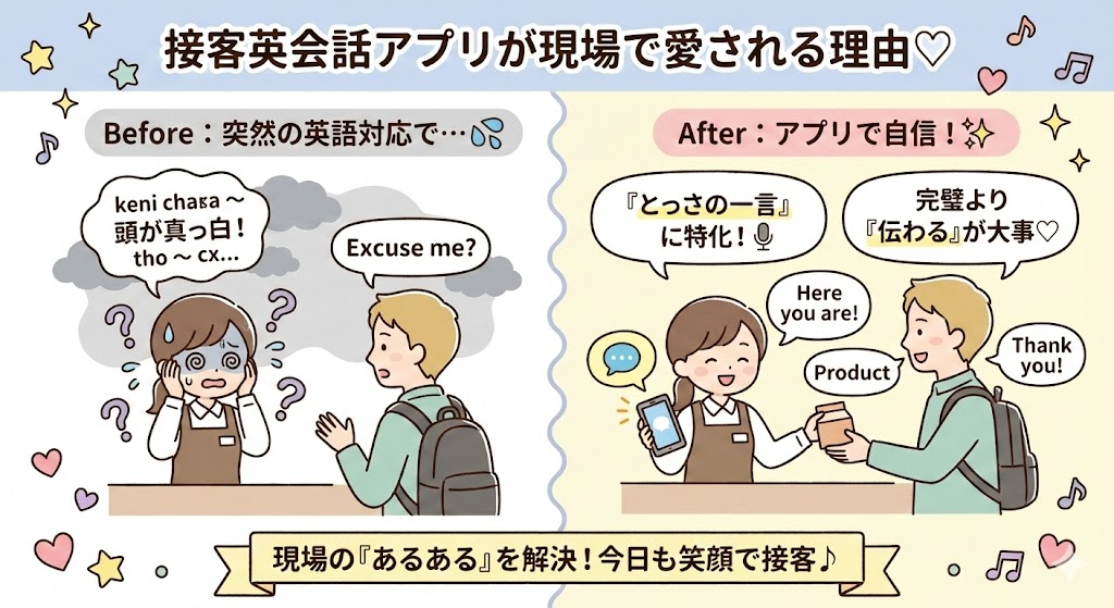 そんな現場の不安をやさしく支えてくれるのが接客英会話アプリ。この記事では、忙しい毎日の中でも無理なく続けられて、仕事にすぐ活かせる使い方を分かりやすくお伝えします。