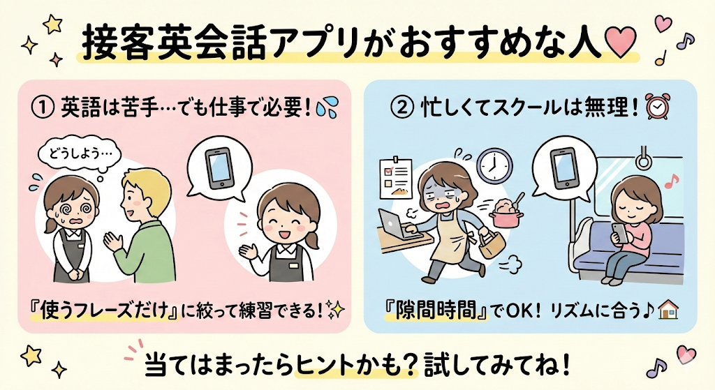 接客英会話アプリと聞くと、「若い人向けでは?」「英語が得意な人が使うものでは?」と感じるかもしれません。でも実際には、英語に苦手意識がある人ほど相性がいいケースが多いんです。ここでは、どんなタイプの人が接客英会話アプリを使うと効果を感じやすいのか、共通点を整理してみましょう。「これ、私のことかも」と思い当たる部分があれば、きっとヒントになります。