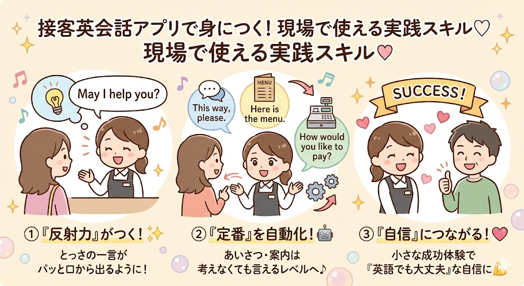 接客英会話アプリを使うと「英語が話せるようになる」というより、「現場で困らなくなる感覚」が先にやってきます。勉強というより、仕事の準備に近いイメージですね。ここでは、実際にどんなスキルが身につくのかを、日々の接客シーンを思い浮かべながら具体的に整理してみましょう。「それ、まさに欲しかったやつ」と感じてもらえるはずです。