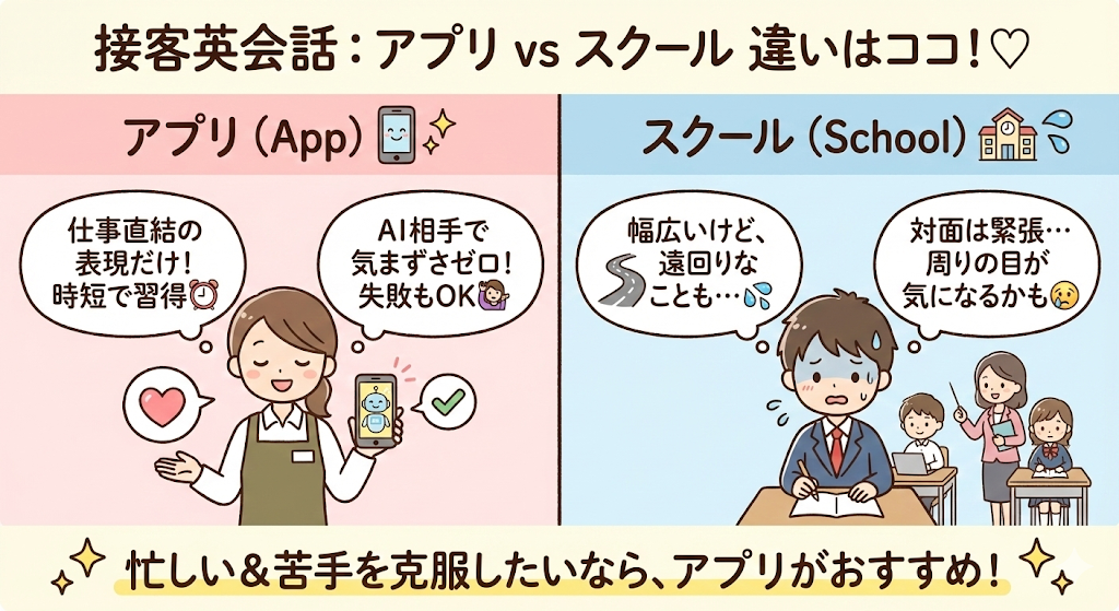 英語を学ぶ手段として、英会話スクールを思い浮かべる人も多いですよね。ただ、接客の現場で「今すぐ使える英語」を求める場合、スクールとアプリでは目的がかなり違ってきます。ここでは、どちらが良い悪いではなく、仕事に直結するという視点で、接客英会話アプリならではの特徴を整理していきます。