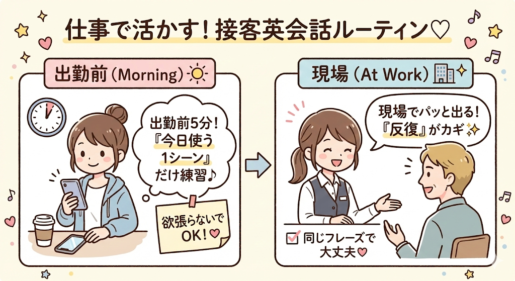 接客英会話アプリは、使い方次第で効果にかなり差が出ます。「時間があるときにまとめて勉強」よりも、「仕事の流れに組み込む」意識がとても大切です。ここでは、忙しい毎日の中でも無理なく続けられて、しかも現場で使える力につながりやすい学習ルーティンを紹介します。完璧を目指さず、続く形を一緒に考えていきましょう。