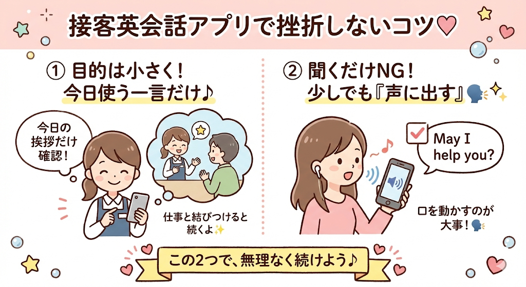接客英会話アプリを使うときは、「今日のシフトで使いそうな一言を確認する」というくらい、目的を小さく設定するのがコツです。英語力アップではなく、“今日を乗り切る準備”だと考えると、気持ちがグッとラクになります。仕事と直結している実感があるだけで、続けやすさは大きく変わります。