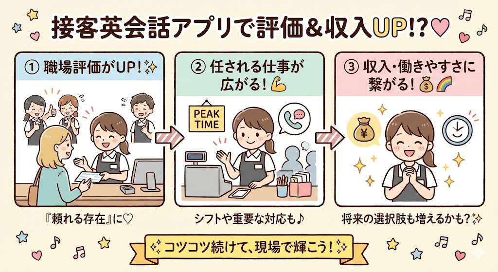 接客英会話アプリは、この「一歩踏み出せる人」になるための準備ツールとも言えます。英語に対する苦手意識が薄れることで、対応を避けなくなり、その姿勢自体が評価されるようになるケースも少なくありません。