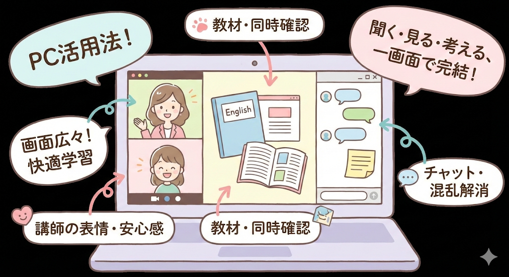 ネイティブキャンプをパソコンで使う最大の利点は、教材画面とチャット画面を同時に見られる点です。スマホだと画面を切り替えるたびに会話が止まりがちですが、PCなら視線を少し動かすだけで確認できます。「今どの単語の話をしているんだっけ?」と焦る場面が減るのは、心理的にもかなりラクです。