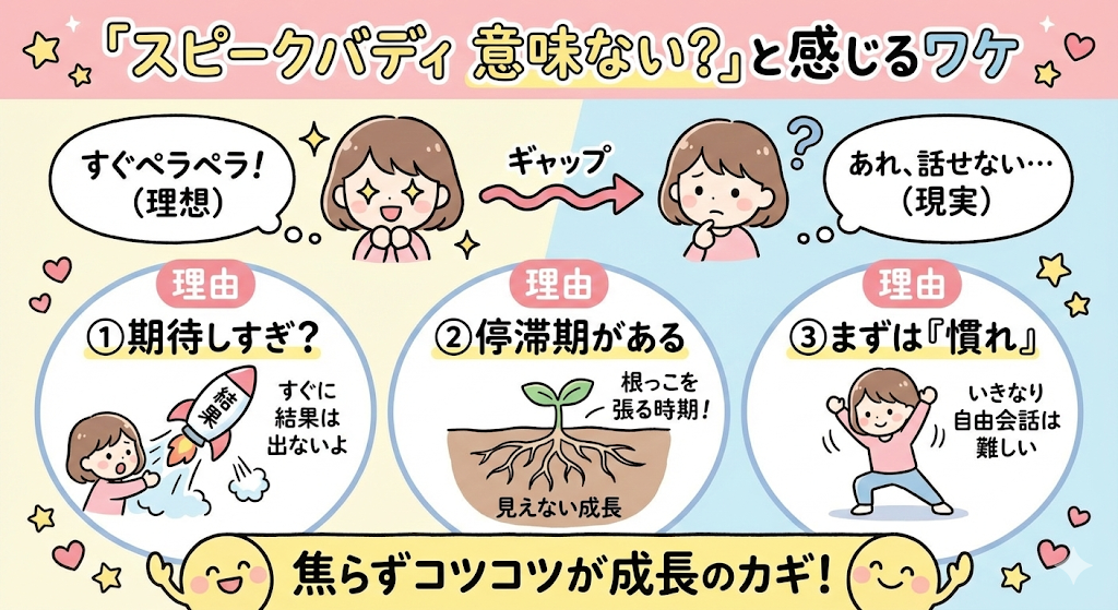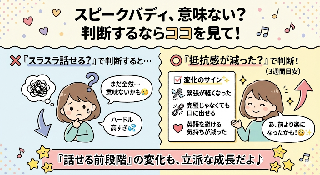 スピークバディは、合わない人にとっては確かに意味ないと感じやすい一方で、判断を急ぎすぎると、本来得られたはずの効果を取り逃してしまうこともあります。