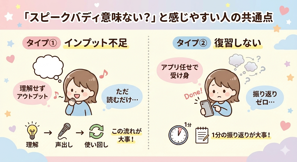 スピークバディを使ってみて「やっぱり意味ないかも…」と感じてしまう人には、実はかなり共通した傾向があります。能力やセンスの問題ではなく、学び方やアプリとの付き合い方のズレによって、効果を感じにくくなっているケースがほとんどです。ここを知っておくだけでも、無駄な自己否定をせずにすみます。