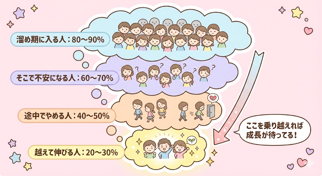 英語学習には、頑張っているのに成長を感じにくい時期があります。単語やフレーズが少しずつ頭に溜まっている段階では、アウトプットの変化が目に見えません。この時期に「意味ない」と判断してやめてしまう人が多いのですが、実はここを越えたあたりから、理解力や反応速度が一気に上がることも少なくありません。