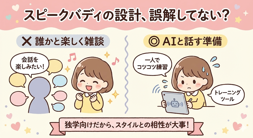 スピークバディは、誰かと雑談を楽しむためのアプリではありません。英語を「話す準備」を整えるためのトレーニングツールという位置づけを理解しておくことが、とても大切です。