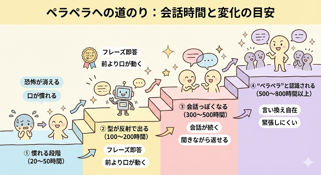 いきなりペラペラにはならないからね。でも具体的な時間を知ると元気もでるよ!