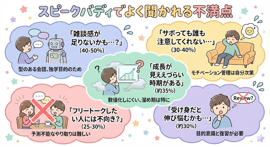 スピークバディは、人と予定を合わせる必要もなく、自分のペースで何度でも練習できる点が強みです。その一方で、「誰かが引っ張ってくれる」「会話を盛り上げてくれる」といった役割は期待できません。この点を理解せずに使い始めると、どうしても物足りなさを感じやすくなります。