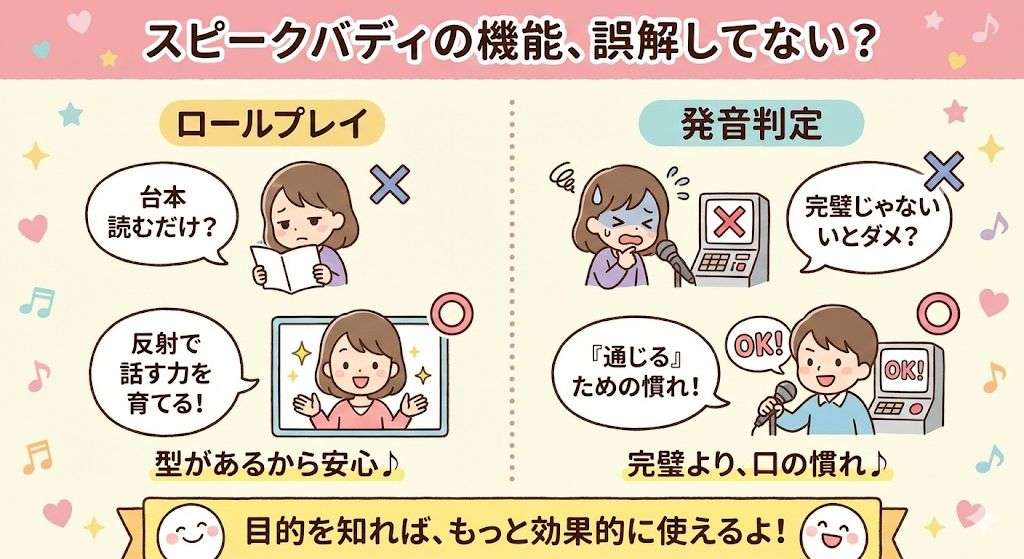 スピークバディには、評価が分かれやすい機能がいくつかあります。使い方を間違えると「意味ない」と感じやすくなりますが、目的を理解して使えば、むしろ大きな助けになる機能でもあります。ここでは特に誤解されやすいポイントを整理していきます。