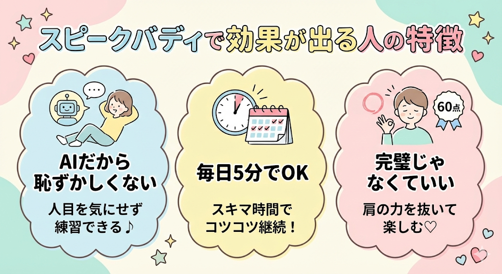スピークバディは、合う人には驚くほど相性が良いアプリです。ここでは、効果を実感しやすい人の特徴を見ていきましょう。