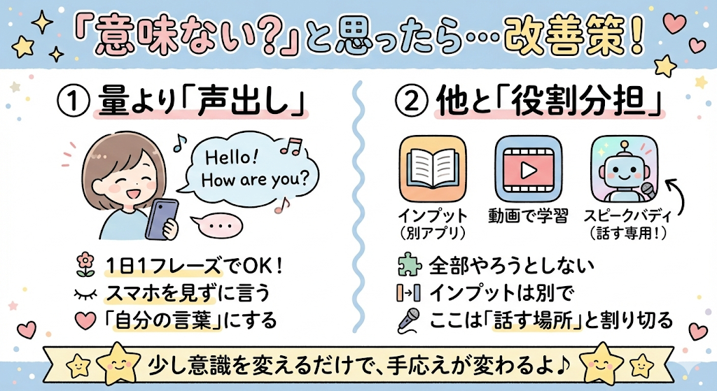 たとえば、インプットは別のアプリや動画で行い、スピークバディは「声に出す場所」と割り切る。この役割分担ができると、「意味ない」と感じる場面が減っていきます。